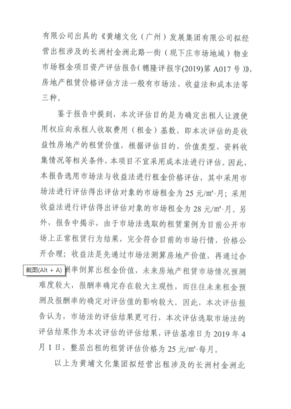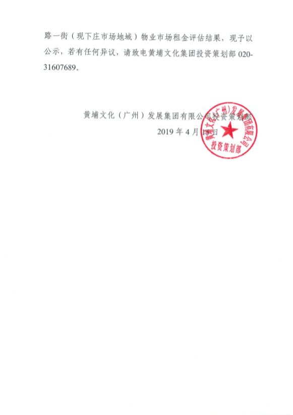 公示:关于黄埔文化集团拟经营出租涉及的长洲村金洲北路一街(现下庄市场地域)物业市场租金评估结果的公示